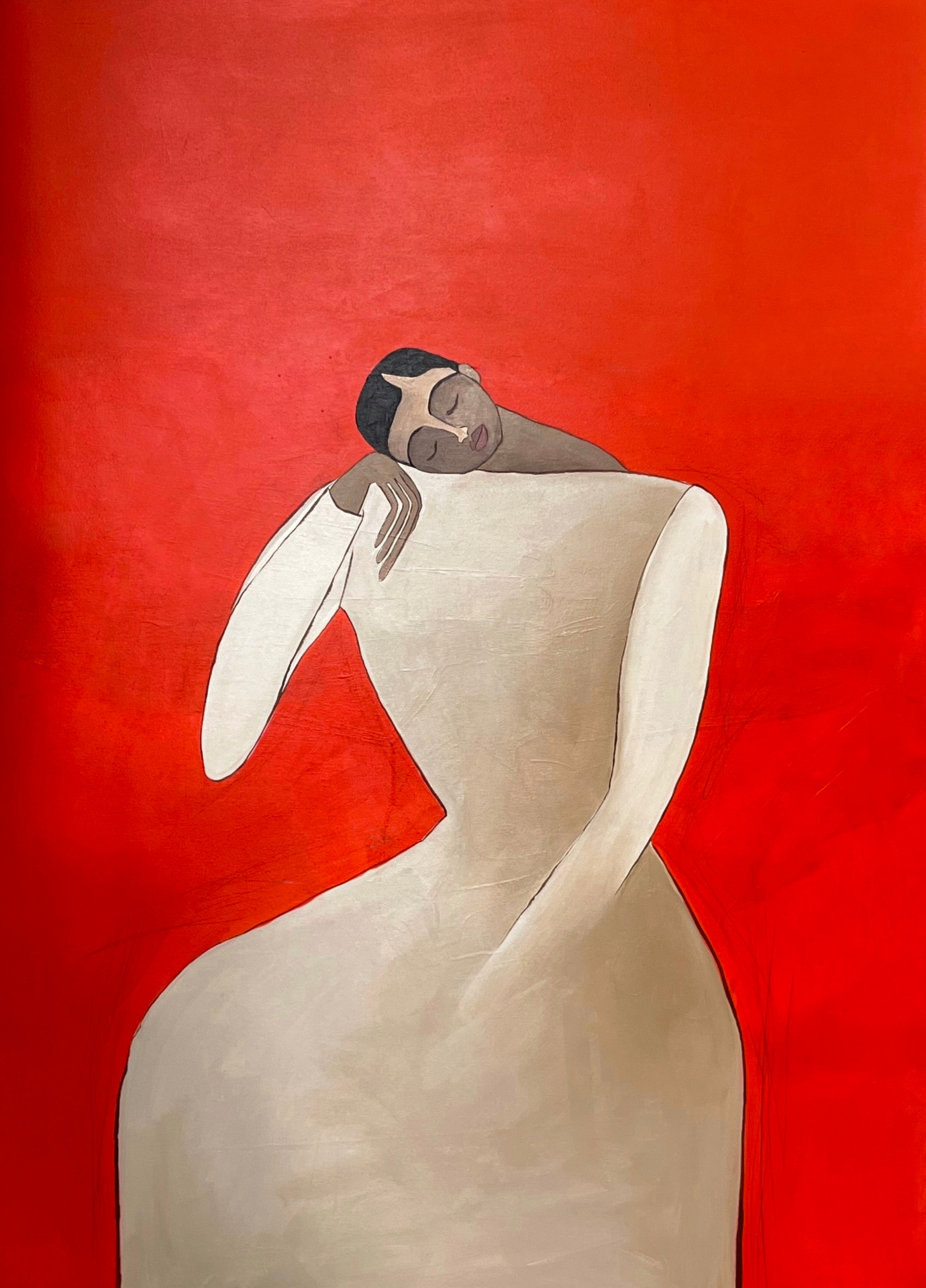 Minimalistická neofigurácia s ikonickým charakterom, v ktorej ženské postavy pôsobia ako nadčasové bytosti medzi realitou a mýtom. Autorka využíva čistú plochu, tlmenú farebnosť a archetypálnu symboliku na vytvorenie vizuálnej rovnováhy medzi minulosťou a súčasnosťou.